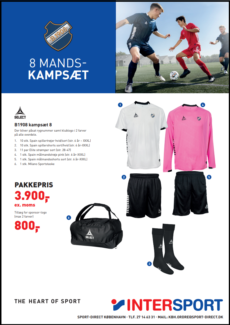 Man kan bestille kampsæt og træningssæt hos Poul i Intersport. Alt tøj vi bruger i B1908 skal være af mærket select. Det er god kvalitet til fornuftige priser.